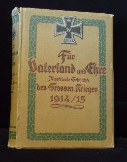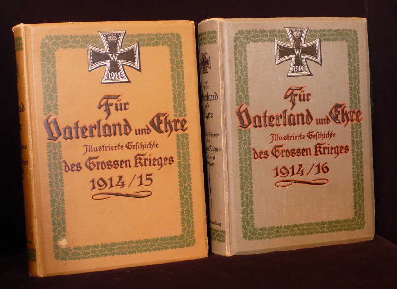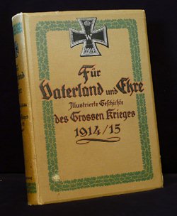 und mit Berücksichtigung vieler Berichte und Briefe von Mitkämpfern zu Wasser und zu Lande Die 3 Bände sind in der Regel intern mit I., II, bzw. III.Sammlung bezeichnet. (geklammerte Angaben) sind nicht gedruckt. Blau = Bestand. Buchtitel: 1914 (ohne Sammlungsbezeichnung) Cover: sandfarben, EK mit W und Eichenlaub ![]() (I. Sammlung): Für Vaterland und Ehre, Illustrierte Geschichte des großen Krieges von 1914, Wahrheitsgetreuer Geschichte des großen Krieges von 1914 von Dr. Wilhelm Kranzler, (1.Auflage), (Weihnachten 1914) (04/2016) 5 Angebote (ZVAB) zwischen 18,00 / 55,00 Durchschnittspreis bei 28,40 Erworben für 16,80 im Internet (08.04.2016 Ebay inkl.Porto). Dieses Buch ist inhaltlich identisch mit dem Buchtitel "1914/15 I. Sammlung". Buchtitel: 1914/15 (I.-II. Sammlung) Cover: sandfarben, ab hier EK mit W ohne Eichenlaub ![]() I. Sammlung: Für Vaterland und Ehre, Illustrierte Geschichte des großen Krieges von 1914/15, Wahrheitsgetreuer Geschichte des großen Krieges von 1914/15, von Dr. Wilhelm Kranzler, (2.Auflage), (1915) ohne I. Sammlung im Innenteil (2.Auflage), (1915) mit I. Sammlung im Innenteil Preisermittlung siehe weiter unten! Erworben für 11,89 im Internet (08.04.2016 Ebay inkl.Porto). Dieses Buch ist inhaltlich identisch mit dem Buchtitel "1914" ohne Sammlungsnummer. II.Sammlung: Für Vaterland und Ehre, Illustrierte Geschichte des großen Krieges von 1914/15, Wahrheitsgetreuer Geschichte des großen Krieges von 1914/15, von Dr. Wilhelm Kranzler, (1.Auflage), (1915) Preisermittlung siehe weiter unten! Erworben für 4,00 in einem Antiquariat (07.04.2016 GI-Guthschrift). Buchtitel: 1914/16 (III. Sammlung) Cover: sandfarben III. Sammlung Für Vaterland und Ehre, Illustrierte Geschichte des großen Krieges von 1914/16, Wahrheitsgetreuer Geschichte des großen Krieges von 1914/16, von Dr. Wilhelm Kranzler, (1.Auflage), (1916) Preisermittlung siehe weiter unten! Erworben für 10,83 im Internet (10.04.2016 Ebay inkl.Porto). Buchtitel: 1914/16 (I.-III. Sammlung) Cover: grünlich I. Sammlung: Für Vaterland und Ehre, Illustrierte Geschichte des großen Krieges von 1914/16, Wahrheitsgetreuer Geschichte des großen Krieges von 1914/15, von Dr. Wilhelm Kranzler, (3.Auflage), (191?) Preisermittlung siehe weiter unten! Erworben für 10,14 im Internet (14.02.2017 Ebay inkl.Porto). II.Sammlung: Für Vaterland und Ehre, Illustrierte Geschichte des großen Krieges von 1914/16, Wahrheitsgetreuer Geschichte des großen Krieges von 1914/15, von Dr. Wilhelm Kranzler, (2.Auflage), (191?) Preisermittlung siehe weiter unten! III. Sammlung Für Vaterland und Ehre, Illustrierte Geschichte des großen Krieges von 1914/16, Wahrheitsgetreuer Geschichte des großen Krieges von 1914/16, von Dr. Wilhelm Kranzler, (2.Auflage), (191?) Preisermittlung siehe weiter unten! Erworben für 10,14 im Internet (14.02.2017 Ebay inkl.Porto). Einzelbände der Sammlungen I.-III.: (04/2016) 14 Angebote (ZVAB) zwischen 9,00 / 64,00 Durchschnittspreis bei 25,64 Sammlung I.-III. zusammen: (04/2016) 1 Angebote (ZVAB) bei 75,00 Durchschnittspreis 75,00; je Buch also bei 25,00