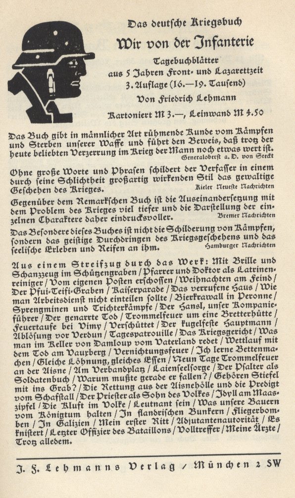 Werbeanzeige von 1931 aus dem Buch "Trotz allem! Ein Buch der Front von Helmut Stellrecht" zur (3.Auflage) 16.-19.Tausend, 1930 ![]() | |||||