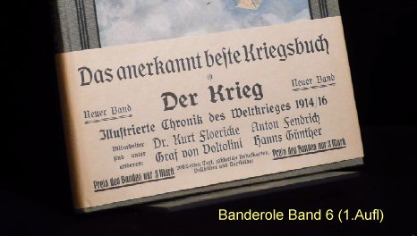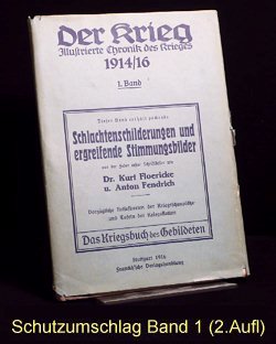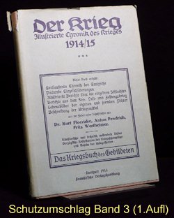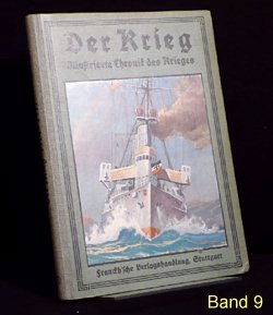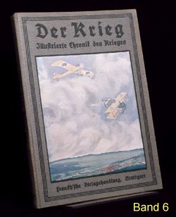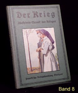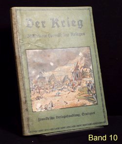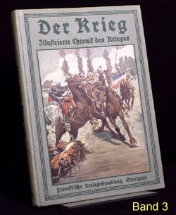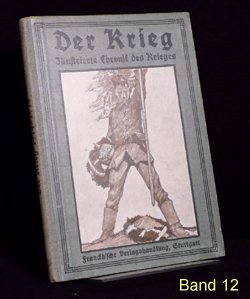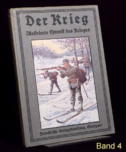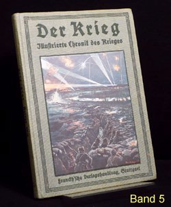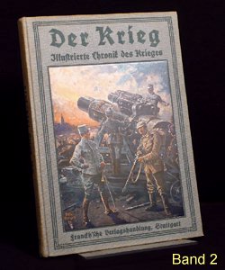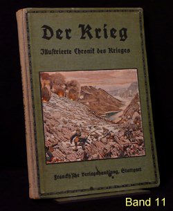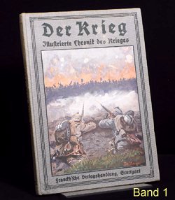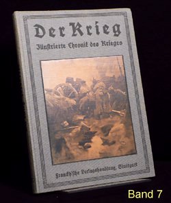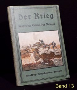 Es gibt verschiedene Auflagen einiger Bände, zu erkennen u.a. an der unterschiedlichen Beschriftung am Buchrücken. Es gibt auch andere Buchreihen in ähnlicher Aufmachung und teils denselben Coverbildern, wie z.B. "Kriegsbuch für die Jugend und das Volk" oder "Der Krieg - Illustrierte Chronik des Krieges" als Sammelband (= 1 Jahrgang in einem Buch). Im folgenden die Einzelbände: (geklammerte Angaben) sind nicht gedruckt. Blau = Bestand. Band 1: Der Krieg, Illustrierte Chronik des Krieges 1914, Erster Band, Chronik des Krieges vom 29.Juli 1914 bis 10.November 1914 Stuttgart 1914, Seite 1-200 (?.Auflage 1916) Rücken: 1914-1916 Erworben für 10,79 im Internet (20.12.2016 EBAY inkl.Porto). Alle Aufl.: (12/2016) 8 Angebote (ZVAB) zwischen 9,83 / 34,00 Durchschnittspreis 18,60 Band 2: Der Krieg, Illustrierte Chronik des Krieges 1914/15, Zweiter Band, Chronik des Krieges vom 11.November 1914 bis 28.Februar 1915 Stuttgart 1915, Seite 201-368 (1.Auflage 1915) Rücken: 1914-1915 Erworben für 4,80 im Internet (12.09.2016 EBAY inkl.Porto). (2.Auflage 1916) Rücken: 1914-1916 Erworben für 10,79 im Internet (20.12.2016 EBAY inkl.Porto). Alle Aufl.: (12/2016) 5 Angebote (ZVAB) zwischen 9,83 / 34,00 Durchschnittspreis 19,77 Band 3: Der Krieg, Illustrierte Chronik des Krieges 1914/15, Dritter Band, Chronik des Krieges vom 1.März 1915 bis 12.Juni 1915 Stuttgart 1915, Seite 369-560 (1.Auflage 1915) Rücken: 1914-1915 Erworben für 10,79 im Internet (20.12.2016 EBAY inkl.Porto). (2.Auflage 1916) Rücken: 1914-1916 Alle Aufl.: (12/2016) 4 Angebote (ZVAB) zwischen 9,83 / 22,00 Durchschnittspreis 16,21 Band 4: Der Krieg, Illustrierte Chronik des Krieges 1914/15, Vierter Band, (II.Jahrgang Bd.1) Chronik des Krieges vom 13.Juni 1915 bis 5.Oktober 1915 Stuttgart 1915, Seite 1-200 (?.Auflage 1916) Rücken: 1914-1916 Erworben für 10,79 im Internet (20.12.2016 EBAY inkl.Porto). Alle Aufl.: (12/2016) 3 Angebote (ZVAB) zwischen 9,83 / 22,00 Durchschnittspreis 16,67 Band 5: Der Krieg, Illustrierte Chronik des Krieges 1914/16, Fünfter Band, (II.Jahrgang Bd.2) Chronik des Krieges vom 6.Oktober 1915 bis 25.Januar 1916 Stuttgart 1916, Seite 201-392 (1.Auflage 1916) Rücken: 1914-1916 Erworben für 10,79 im Internet (20.12.2016 EBAY inkl.Porto). Alle Aufl.: (12/2016) 5 Angebote (ZVAB) zwischen 9,83 / 34,00 Durchschnittspreis 20,50 Band 6: Der Krieg, Illustrierte Chronik des Krieges 1914/16, Sechster Band, (Zweiter Jahrgang Bd.III) Chronik des Krieges vom 26.Januar 1916 bis 24.Mai 1916 Stuttgart 1916, Seite 393-584 (1.Auflage 1916) Rücken: 1914-1916 Erworben für 10,79 im Internet (20.12.2016 EBAY inkl.Porto). Alle Aufl.: (12/2016) 5 Angebote (ZVAB) zwischen 14,99 / 22,00 Durchschnittspreis 19,93 Band 7: Der Krieg, Illustrierte Chronik des Krieges 1914/16, Siebter Band, (Dritter Jahrgang Bd.I) Chronik des Krieges vom 25.Mai 1916 bis 24.September 1916 Stuttgart 1916, Seite 1-192 (1.Auflage 1916) Rücken: 1914-1916 Erworben für 10,79 im Internet (20.12.2016 EBAY inkl.Porto). Alle Aufl.: (12/2016) 0 Angebote (ZVAB) zwischen 0,00 / 0,00 Durchschnittspreis 0,00 Band 8: Der Krieg, Illustrierte Chronik des Krieges 1916/17, Achter Band, (Dritter Jahrgang Bd.II) Chronik des Krieges vom 25.September 1916 bis 29.Januar 1917 Stuttgart 1917, Seite 193-384 (1.Auflage 1917) Rücken: 1914-1917 Erworben für 10,79 im Internet (20.12.2016 EBAY inkl.Porto). Alle Aufl.: (12/2016) 1 Angebot (ZVAB) zwischen 14,99 / 14,99 Durchschnittspreis 14,99 Band 9: Der Krieg, Illustrierte Chronik des Krieges 1916/17, Neunter Band, (Dritter Jahrgang Bd.III) Chronik des Krieges vom 30.Januar 1917 bis 29.April 1917 Stuttgart 1917, Seite 385-576 (1.Auflage 1917) Rücken: 1914-1917 Erworben für 10,79 im Internet (20.12.2016 EBAY inkl.Porto). Alle Aufl.: (12/2016) 1 Angebot (ZVAB) zwischen 18,00 / 18,00 Durchschnittspreis 18,00 Band 10: Der Krieg, Illustrierte Chronik des Krieges 1916/17, Zehnter Band, (Vierter Jahrgang Band I) Chronik des Krieges vom 30.April 1917 bis 20.Oktober 1917 Stuttgart 1917, Seite 1-236 (?.Auflage 1918) Rücken: 1914-1918 Erworben für 10,79 im Internet (20.12.2016 EBAY inkl.Porto). Alle Aufl.: (12/2016) 0 Angebote (ZVAB) zwischen 0,00 / 0,00 Durchschnittspreis 0,00 Band 11: Der Krieg, Illustrierte Chronik des Krieges 1917/18, Elfter Band, (Vierter Jahrgang Band II) Chronik des Krieges vom 21.Oktober 1917 bis 19.Juni 1918 Stuttgart 1918, Seite 237-448 (1.Auflage 1918) Rücken: 1914-1918 Erworben für 23,00 im Internet (24.12.2016 ZVAB inkl.Porto). Alle Aufl.: (12/2016) 0 Angebote (ZVAB) zwischen 0,00 / 0,00 Durchschnittspreis 0,00 Band 12: Der Krieg, Illustrierte Chronik des Krieges 1918/19, Zwölfter Band, (Fünfter Jahrgang, Band I) Chronik des Krieges vom 20.Juni 1918 bis 25.Oktober 1918 (geht aber bis 26.Oktober) Stuttgart 1919, Seite 1-172 (1.Auflage 1919) Rücken: 1914-1918 Erworben für 10,79 im Internet (20.12.2016 EBAY inkl.Porto). Alle Aufl.: (12/2016) 0 Angebote (ZVAB) zwischen 0,00 / 0,00 Durchschnittspreis 0,00 Band 13: Der Krieg, Illustrierte Chronik des Krieges 1918/19, Dreizehnter Band, (Fünfter Jahrgang, Band II) Chronik des Krieges vom 27.Oktober 1918 bis 15.November 1918 Stuttgart 1919, Seite 173-336 Beilage Faltblatt "Nationalwahl-Karte 1919" 3 Umschlagseite (1.Auflage 1919) Rücken: 1914-1918 Erworben für 10,79 im Internet (20.12.2016 EBAY inkl.Porto). Alle Aufl.: (12/2016) 0 Angebote (ZVAB) zwischen 0,00 / 0,00 Durchschnittspreis 0,00 Band 1-13 zusammen: (12/2016) 1 Angebot (Internet) zwischen 299,00 / 299,00 Durchschnittspreis 299,00; je Buch also bei 23,00 Erworben für 145,00 im Internet (08.04.2016 EBAY inkl.Porto).