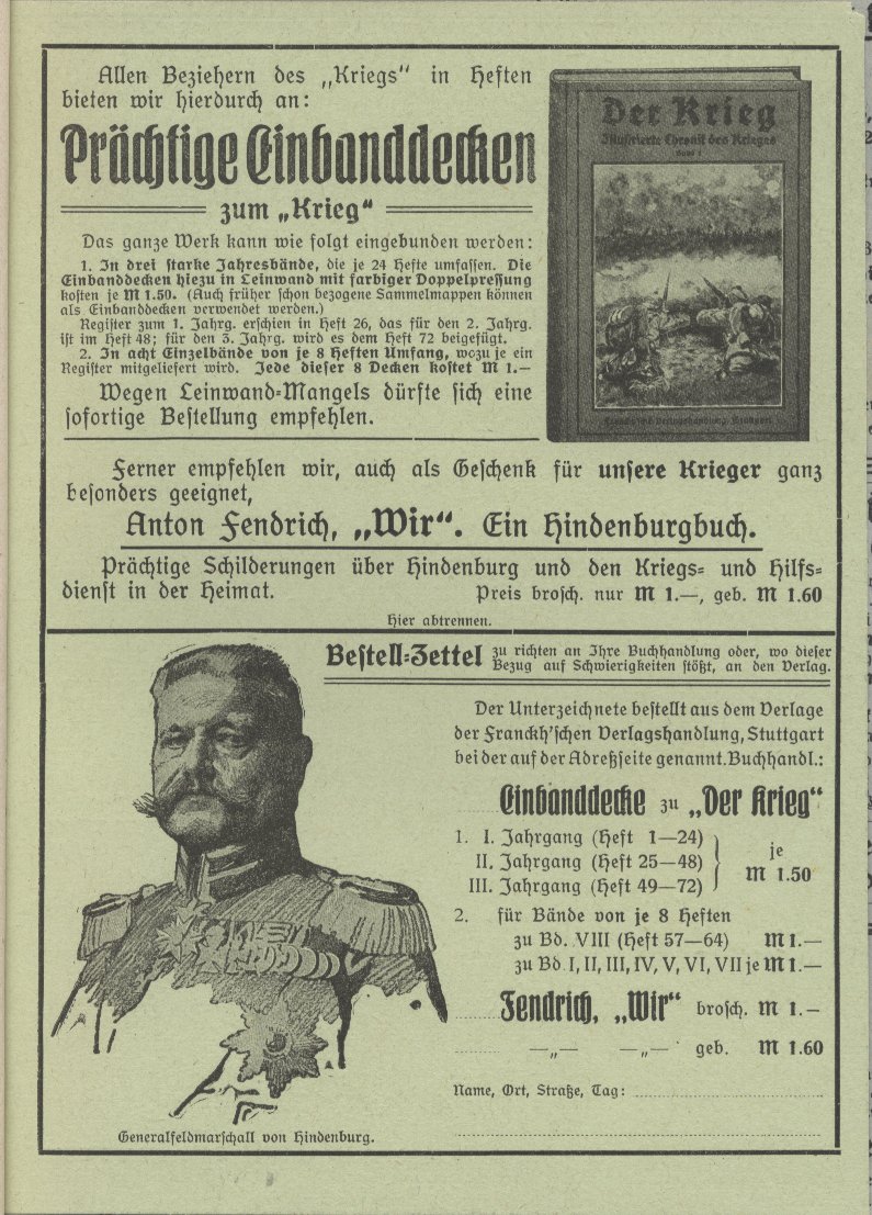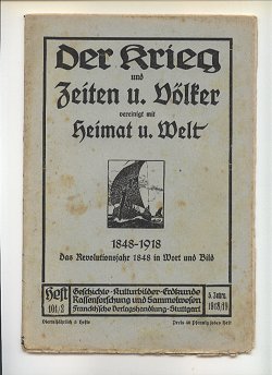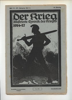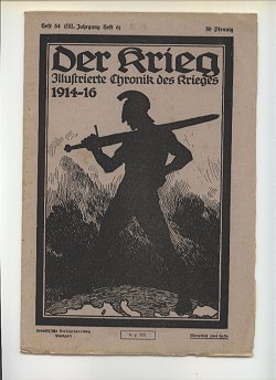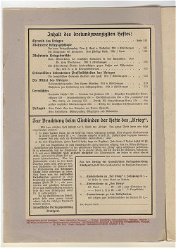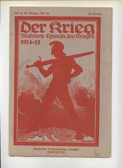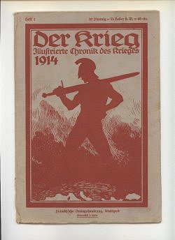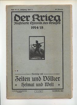 Die Zeitschriftenserie: Titel: Heft 1-10: Der Krieg Illustrierte Chronik des Krieges 1914 Heft 11-37: Der Krieg Illustrierte Chronik des Krieges 1914-15 Heft 38-61: Der Krieg Illustrierte Chronik des Krieges 1914-16 Heft 62-82: Der Krieg Illustrierte Chronik des Krieges 1914-17 Heft 83-92: Der Krieg Illustrierte Chronik des Krieges 1914-18 Heft 93-100: Der Krieg Illustrierte Chronik des Krieges 1914-18 vereinigt mit Zeiten und Völker * Heimat und Welt * Heft 101-112: Der Krieg Illustrierte Chronik des Krieges 1914-18 und Zeiten und Völker vereinigt mit Heimat u Welt * Cover: Heft 1-27: weiß/beiges Umschlagspapier, Druck dunkelrot Anmerkung: Heft 27 gibt es in dunkelrot und in hellrot Heft 27-37: weiß/beiges Umschlagspapier, Druck hellrot Heft 38-65: weiß/beiges Umschlagspapier, Druck schwarz Heft 66-92: grün/bläuliches Umschlagspapier, Druck schwarz Heft 93-100: geändertes Coverdesign, Titelbild Schwertkämpfer jetzt als Kleinbild Heft 101-112: geändertes Coverdesign, Titelbild Schwertkämpfer jetzt Schiff jetzt als Kleinbild Heft 1-8 = Band 1 Heft 1, Seite 1-24, Copyright Stuttgart 10.August 1914 Heft 2, Seite 25-48, Copyright Stuttgart 5.September 1914 Heft 3, Seite 49-72, Copyright Stuttgart 20. September 1914 Heft 4, Seite 73-96, Copyright Stuttgart 30. September 1914 Heft 5, Seite 97-120, Copyright Stuttgart 15. Oktober 1914 Heft 6, Seite 121-144, Copyright Stuttgart 31. Oktober 1914 Heft 7, Seite 145-168, Copyright Stuttgart 10. November 1914 Heft 8, Seite 169-200, Copyright Stuttgart 15. November 1914 Heft 9-16 = Band 2 Heft 9, Seite 201-224, Copyright Stuttgart 5. Dezember 1914 Heft 10, Seite 225-240, Copyright Stuttgart 16. Dezember 1914 Heft 11, Seite 241-264, Copyright Stuttgart 29. Dezember 1914 Heft 12, Seite 265-280, Copyright Stuttgart 16. Januar 1915 Heft 13, Seite 281-296, Copyright Stuttgart 1. Februar 1915 Heft 14, Seite 297-320, Copyright Stuttgart 15. Februar 1915 Heft 15, Seite 321-344, Copyright Stuttgart 1. März 1915 Heft 16, Seite 345-368, Copyright Stuttgart 15. März 1915 Heft 17-24 = Band 3 Heft 17, Seite 369-392, Copyright Stuttgart 15. April 1915 Heft 18, Seite 393-416, Copyright Stuttgart 30. April 1915 Heft 19, Seite 417-448, Copyright Stuttgart 10. Mai 1915 Heft 20, Seite 449-472, Copyright Stuttgart 25. Mai 1915 Heft 21, Seite 473-496, Copyright Stuttgart 5. Juni 1915 Heft 22, Seite 497-512, Copyright Stuttgart 12. Juni 1915 Heft 23, Seite 513-536, Copyright Stuttgart 10. Mai 1915 Bestand = Umschlag von Heft 19 überstempelt mit 23, innen ein eingeklebter Zettel: "Inhalt des dreiundzwanstigsten Heftes:" Heft 24, Seite 537-560, Copyright Stuttgart 26. Juni 1915 Heft 25-32 = Band 4 Heft 25, Seite 1-24, Copyright Stuttgart 15. Juli 1915 = II. Jahrgang Heft 1 Heft 26, Seite 25-48, Copyright Stuttgart 31. Juli 1915 = II. Jahrgang Heft 2 Anmerkung: Der Beitrag "Vermischtes:" Seite 45-48 ist zwischen Seite 40 und 41 eingeheftet! Heft 27, Seite 49-72, Copyright Stuttgart 10. August 1915 = II. Jahrgang Heft 3 Heft 28, Seite 73-96, Copyright Stuttgart 26. August 1915 = II. Jahrgang Heft 4 Heft 29, Seite 97-120, Copyright Stuttgart 10. September 1915 = II. Jahrgang Heft 5 Heft 30, Seite 121-144, Copyright Stuttgart 25. September 1915 = II. Jahrgang Heft 6 Heft 31, Seite 145-168, Copyright Stuttgart 9. Oktober 1915 = II. Jahrgang Heft 7 Heft 32, Seite 169-200, Copyright Stuttgart 23. Oktober 1915 = II. Jahrgang Heft 8 Heft 33-40 = Band 5 Heft 33, Seite 201-224, Copyright Stuttgart 06. November 1915 = II. Jahrgang Heft 9 Heft 34, Seite 225-248, Copyright Stuttgart 20. November 1915 = II. Jahrgang Heft 10 Heft 35, Seite 249-272, Copyright Stuttgart 4. Dezember 1915 = II. Jahrgang Heft 11 Anmerkung: Doppelband Heft 10/11 Jg II (=34/35) bekannt! Heft 36, Seite 273-296, Copyright Stuttgart 18. Dezember 1915 = II. Jahrgang Heft 12 Heft 37, Seite 297-320, Copyright Stuttgart 31. Dezember 1915 = II. Jahrgang Heft 13 Bestand = Die farbige Tafel fehlt. Heft 38, Seite 321-344, Copyright Stuttgart 15. Januar 1916 = II. Jahrgang Heft 14 Mit Beizettel, daß die vorgesehene Reliefkarte infolge der neuesten militärischen Bestimmungen nicht beigelegt werden konnte. Heft 39, Seite 345-368, Copyright Stuttgart 29. Januar 1916 = II. Jahrgang Heft 15 Mit Hinweis: "Die zu diesem Heft vorgesehene Reliefkarte wird später kostenlos nachgeliefert." Heft 40, Seite 369-392, Copyright Stuttgart 12. Februar 1916 = II. Jahrgang Heft 16 Mit Hinweis: "Die beigegebene Reliefkarte Polen II, ... gilt als Ersatz für die in Heft 38 zugesagte Karte." Weiterer Hinweis: Die übliche farbige Tafel findet der Leser bereits in Heft 37. Heft 41-48 = Band 6 Heft 41, Seite 393-416, Copyright Stuttgart 4. März 1916 = II. Jahrgang Heft 17 Heft 42, Seite 417-440, Copyright Stuttgart 18. März 1916 = II. Jahrgang Heft 18 Heft 43, Seite 441-464, Copyright Stuttgart 31. März 1916 = II. Jahrgang Heft 19 Heft 44, Seite 465-488, Copyright Stuttgart 15. April 1916 = II. Jahrgang Heft 20 Heft 45, Seite 489-512, Copyright Stuttgart 6. Mai 1916 = II. Jahrgang Heft 21 Heft 46, Seite 513-536, Copyright Stuttgart 20. Mai 1916 = II. Jahrgang Heft 22 Heft 47, Seite 537-560, Copyright Stuttgart 3. Juni 1916 = II. Jahrgang Heft 23 Heft 48, Seite 561-584, Copyright Stuttgart 17. Juni 1916 = II. Jahrgang Heft 24 Heft 49-56 = Band 7 Heft 49, Seite 1-24, Copyright Stuttgart 8. Juli 1916 = III. Jahrgang Heft 1 Heft 50, Seite 25-48, Copyright Stuttgart 22. Juli 1916 = III. Jahrgang Heft 2 Heft 51, Seite 49-72, Copyright Stuttgart 5. August 1916 = III. Jahrgang Heft 3 Mit Hinweis: "Einem vielfachen geäußerten Wusnche zufolge werden die Hefte unseres 'Krieg' - des leichteren Einbindens wegen - von jetzt ab unbeschnitten zur Ausgabe gelangen." Heft 52, Seite 73-96, Copyright Stuttgart 19. August 1916 = III. Jahrgang Heft 4 Heft 53, Seite 97-120, Copyright Stuttgart 2. September 1916 = III. Jahrgang Heft 5 Heft 54, Seite 121-144, Copyright Stuttgart 16. September 1916 = III. Jahrgang Heft 6 Heft 55, Seite 145-168, Copyright 