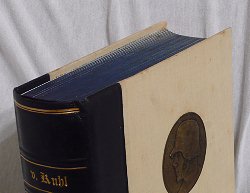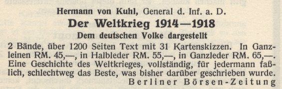 Aus dem Vorwort (Band I, 11. bis 15.Tausend) Das vorliegende Werk ist aus Aufsätzen entstanden, die im Laufe von fünf Jahren in der "Berliner Börsenzeitung" unter der Überschrift "Gedenktage des Weltkrieges" erschienen sind. Da die Ausätze vielfach Anklang gefunden haben, sind sie von mir zu einer zusammenhängenden Geschichte des Weltkrieges umgearbeitet worden, ... Eine Geschichte des Weltkrieges, in der Form, wie ich sie darzubieten bezwecke, ist zur Zeit nicht vorhanden. ... Wir wollen wissen, weshalb wir den Krieg verloren haben. ... Halblederausgabe Band 1, 1929 ![]() oben mit blauem Schnitt: