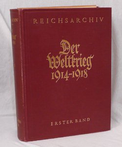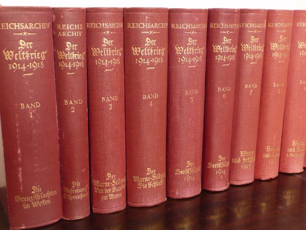 Aus dem Vorwort Erster Band, 1925: Dem Reichsarchiv ist bei seiner Gründung im Jahre 1919 die Aufgabe gestellt worden, das in der laufenden Verwaltung des Reiches nicht mehr benötigte Aktenmaterial zur Reichsgeschichte zu sammeln und durch wissenschaftliche Veröffentlichungen nutzbar zu machen.Im Rahmen dieses Auftrages war die Abfassung einer Geschichte des Weltkrieges die nächstliegende und wichtigste Aufgabe, zumal die militärischen und sonstigen Kriegsakten den Grundstock der archivalischen Bestände des reichsarchivs bildeten. Auch war es der Wunsch des deutschen Volkes, möglichst bald über die schicksalsschweren Ereignisse der jüngsten Vergangenheit durch wissenschaftliche einwandfreie Darstellung unterrichtet zu werden. ... Potsdam, den 1.Oktober 1924. (geklammerte Angaben) sind nicht gedruckt. Blau = Bestand. Band 1 - 9: Bearbeitet im Reichsarchiv Die militärischen Operationen zu Lande Band 1: Erster Band: Die Grenzschlachten im Westen Mit vielen Skizzen im Text und zwölf Karten (sind echte 7x Karten) Karte 6 beinhaltet die Karten: a-f. Rote Leinenausgabe: (1.Auflage), 1925 Erworben im Internet für 9,07 (25.02.2017 EBAY Kleinanzeigen). (02/2017) Angebote: noch nicht recherchiert zwischen 0,00 / 0,00 Durchschnittspreis 0,00 Halblederausgabe: (1.Auflage), 1925 Erworben im Internet für 10,50 (04.03.2017 EBAY). (02/2017) Angebote: noch nicht recherchiert zwischen 0,00 / 0,00 Durchschnittspreis 0,00 Bei Band 1 angeblich immer wieder fehlende Karten: von 12 nur 7 da. Es sind nur echte 7 Kartenblätter mit 12 Karten drauf! Band 2: Zweiter Band: Die Befreiung Ostpreußens Mit vierzehn Karten und elf Skizzen (sind echte 14x Karten + 1x Anlage 2) Rote Leinenausgabe: (1.Auflage), 1925 Erworben im Internet für 9,07 (25.02.2017 EBAY Kleinanzeigen). (02/2017) Angebote: noch nicht recherchiert zwischen 0,00 / 0,00 Durchschnittspreis 0,00 Halblederausgabe: (1.Auflage), 1925 Erworben im Internet für 10,50 (04.03.2017 EBAY). (02/2017) Angebote: noch nicht recherchiert zwischen 0,00 / 0,00 Durchschnittspreis 0,00 Band 3: Dritter Band: Der Marne-Feldzug. Von der Sambre zur Marne Mit sieben Karten und elf Skizzen (sind echte 7x Karten + 4x Skizzenblatt) Rote Leinenausgabe: (1.Auflage), 1926 Erworben im Internet für 9,07 (25.02.2017 EBAY Kleinanzeigen). (02/2017) Angebote: noch nicht recherchiert zwischen 0,00 / 0,00 Durchschnittspreis 0,00 Halblederausgabe: (1.Auflage), 1926 Erworben im Internet für 10,50 (04.03.2017 EBAY). (02/2017) Angebote: noch nicht recherchiert zwischen 0,00 / 0,00 Durchschnittspreis 0,00 Band 4: Vierter Band: Der Marne-Feldzug. Die Schlacht. Mit zehn Karten und sechs Skizzen (sind echte 10x Karten + 2x Skizzenblatt) Rote Leinenausgabe: (1.Auflage), 1926 Erworben im Internet für 9,07 (25.02.2017 EBAY Kleinanzeigen). (02/2017) Angebote: noch nicht recherchiert zwischen 0,00 / 0,00 Durchschnittspreis 0,00 Halblederausgabe: (1.Auflage), 1926 Erworben im Internet für 10,50 (04.03.2017 EBAY). (02/2017) Angebote: noch nicht recherchiert zwischen 0,00 / 0,00 Durchschnittspreis 0,00 Band 5: Fünfter Band: Der Herbst-Feldzug 1914. Im Westen bis zum Stellungskrieg. Im Osten bis zum Rückzug. Mit achtzehn Karten und vierzehn Skizzen (sind echte 17x Karten + 5x Skizzenblatt) [Karte 18 ist auf Kartenblatt 16 unten mit drauf!] Rote Leinenausgabe: (1.Auflage), 1929 Erworben im Internet für 9,07 (25.02.2017 EBAY Kleinanzeigen). (02/2017) Angebote: noch nicht recherchiert zwischen 0,00 / 0,00 Durchschnittspreis 0,00 Halblederausgabe: (1.Auflage), 1929 Erworben im Internet für 10,50 (04.03.2017 EBAY). (02/2017) Angebote: noch nicht recherchiert zwischen 0,00 / 0,00 Durchschnittspreis 0,00 Bei Band 5 angeblich immer wieder fehlende Karte 18, siehe Anmerkungen unten! Band 6: Sechster Band: Der Herbst-Feldzug 1914. Der Abschluß der Operationen im Westen und Osten. Mit einundzwanzig Karten und Skizzen (sind echte 15x Beilagen) Rote Leinenausgabe: (1.Auflage), 1929 Erworben im Internet für 9,07 (25.02.2017 EBAY Kleinanzeigen). (02/2017) Angebote: noch nicht recherchiert zwischen 0,00 / 0,00 Durchschnittspreis 0,00 Halblederausgabe: (1.Auflage), 1929 Erworben im Internet für 10,50 (04.03.2017 EBAY). (02/2017) Angebote: noch nicht recherchiert zwischen 0,00 / 0,00 Durchschnittspreis 0,00 Band 7: Siebter Band: Die Operationen des Jahres 1915. Die Ereignisse im Winter und Frühjahr. Mit vierzig Karten und Skizzen (sind echte 18x Karten + 11x Skizzenblätter) Rote Leinenausgabe: (1.Auflage), 1931 Erworben im Internet für 9,07 (25.02.2017 EBAY Kleinanzeigen). (02/2017) Angebote: noch nicht recherchiert zwischen 0,00 / 0,00 Durchschnittspreis 0,00 Halblederausgabe: (1.Auflage), 1931 Erworben im Internet für 10,50 (04.03.2017 EBAY). (02/2017) Angebote: noch nicht recherchiert zwischen 0,00 / 0,00 Durchschnittspreis 0,00 Band 8: Band Acht: Die Operationen des Jahres 1915. Die Ereignisse im Westen im Frühjahr und Sommer, im Osten vom Frühjahr bis zum Jahresschluß. Mit neununddreißig Karten und Skizzen (sind echte 7x Karten + 11x Skizzenblätter + 1x Anlage 1) Rote Leinenausgabe: (1.Auflage), 1932 Erworben im Internet für 9,07 (25.02.2017 EBAY Kleinanzeigen). (02/2017) Angebote: noch nicht recherchiert zwischen 0,00 / 0,00 Durchschnittspreis 0,00 Halblederausgabe: (1.Auflage), 1932 Erworben im Internet für 10,50 (04.03.2017 EBAY). (02/2017) Angebote: noch nicht recherchiert zwischen 0,00 / 0,00 Durchschnittspreis 0,00 Band 9: Band Neun: Die Operationen des Jahres 1915. Die Ereignisse im Westen und auf dem Balkan vom Sommer bis zum Jahresschluß. Mit vierunddreißig Karten und Skizzen (sind echte 5x Karten + 17x Skizzenblätter + 4x Anlagenblätter) Rote Leinenausgabe: (1.Auflage), 1933 Erworben im Internet für 9,07 (25.02.2017 EBAY Kleinanzeigen). (02/2017) Angebote: noch nicht recherchiert zwischen 0,00 / 0,00 Durchschnittspreis 0,00 Halblederausgabe: (1.Auflage), 1933 Erworben im Internet für 10,50 (04.03.2017 EBAY). (02/2017) Angebote: noch nicht recherchiert zwischen 0,00 / 
