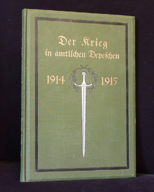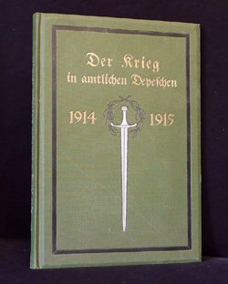 Von der Seite 1, Band I.: Deutschlands größte Stunde ist über uns: eine Welt steht gegen uns in Waffen. Wie früh oder wie spät der Kampf der Völker ausgefochten sein wird - noch wissen wir es nicht. Die ungeheure, den ganzen Erdball umspannende Ausdehnung des Kriegsschuplatzes, die bis aufs höchste entwickelte Kriegstechnik der Gegenwart bedingen notgedrungen eine gewisse Zurückhaltung in der Ausgabe von Berichten. Kommen sie aber, diese Berichte, so sind sie uns doppelt teuer und wert. ... (geklammerte Angaben) sind nicht gedruckt. Blau = Bestand. Buchtitel Band 1-6 : Der Krieg in amtlichen Depeschen 1914/15 Band I-III.: Gesammelt und herausgegeben vom Flottenbund Deutscher Frauen e.V. Ortsgruppe Dessau= zum Besten bedürftiger Hinterbliebener von Angehörigen der Deutschen Kriegs-Marine. Band I: August, September, Oktober 1914 Seiten: 1-192 Erworben im Internet für 12,50 inkl Porto (06.03.2017 Ebay-Kleinanzeigen). (03/2017) Angebote: 5 (ZVAB) zwischen 15,00 / 20,00 Durchschnittspreis 17,60 Band II: November, Dezember 1914, Januar 1915 Seiten: 193-384 Erworben im Internet für 12,50 inkl Porto (06.03.2017 Ebay-Kleinanzeigen). (03/2017) Angebote: 0 (ZVAB) zwischen 0,00 / 0,00 Durchschnittspreis 0,00 Band III: Februar, März, April 1915 Seiten: 385-576 Erworben im Internet für 12,50 inkl Porto (06.03.2017 Ebay-Kleinanzeigen). (03/2017) Angebote: 0 (ZVAB) zwischen 0,00 / 0,00 Durchschnittspreis 0,00 Band 4-8: Gesammelt und herausgegeben von der Reichs-Spende zu Gunsten der Nationalstiftung für die Hinterbliebenen der im Kriege Gefallenen. Band IV: Mai, Juni, Juli 1915 Seiten: 577-768 Erworben im Internet für 12,50 inkl Porto (06.03.2017 Ebay-Kleinanzeigen). (03/2017) Angebote: 1 (ZVAB) zwischen 20,00 / 20,00 Durchschnittspreis 20,00 Band V: August, September, Oktober 1915 Seiten: 569-968 Erworben im Internet für 12,50 inkl Porto (06.03.2017 Ebay-Kleinanzeigen). (03/2017) Angebote: 1 (ZVAB) zwischen 20,00 / 20,00 Durchschnittspreis 20,00 Band VI: November, Dezember 1915, Januar 1916 Seiten: 969-1160; Innentitel: 1914/16; Außencover noch: 1914/15 Erworben im Internet für 12,50 inkl Porto (06.03.2017 Ebay-Kleinanzeigen). (03/2017) Angebote: 3 (ZVAB) zwischen 15,00 / 18,00 Durchschnittspreis 17,00 Buchtitel Band 7-9 : Der Krieg in amtlichen Depeschen 1914/16 Band VII: Februar, März, April 1916 Seiten: 1161-1352 Erworben im Internet für 12,50 inkl Porto (06.03.2017 Ebay-Kleinanzeigen). (03/2017) Angebote: 1 (ZVAB) zwischen 20,00 / 20,00 Durchschnittspreis 20,00 Band VIII: Mai, Juni, Juli 1916 Seiten: 1353-1544 Erworben im Internet für 12,50 inkl Porto (06.03.2017 Ebay-Kleinanzeigen). (03/2017) Angebote: 0 (ZVAB) zwischen 0,00 / 0,00 Durchschnittspreis 0,00 Ab Band 9: ohne Hinweis, nur noch Verlag Wirth & Co, Dessau. Band IX: August, September, Oktober 1916 Seiten: 1545-1736 Erworben im Internet für 12,50 inkl Porto (06.03.2017 Ebay-Kleinanzeigen). (03/2017) Angebote: 1 (ZVAB) zwischen 15,00 / 15,00 Durchschnittspreis 15,00 Buchtitel Band 10-13 : Der Krieg in amtlichen Depeschen 1914/17 Band X: November, Dezember 1916, Januar 1917 Seiten: 1737-1928 Erworben im Internet für 12,50 inkl Porto (06.03.2017 Ebay-Kleinanzeigen). (03/2017) Angebote: 2 (ZVAB) zwischen 15,00 / 20,00 Durchschnittspreis 17,50 Band XI: Februar, März, April 1917 Seiten: 1929-2120 Erworben im Internet für 12,50 inkl Porto (06.03.2017 Ebay-Kleinanzeigen). (03/2017) Angebote: 3 (ZVAB) zwischen 15,00 / 20,00 Durchschnittspreis 17,66 Band XII: Mai, Juni, Juli 1917 Seiten: 2121-2312 Erworben im Internet für 12,50 inkl Porto (06.03.2017 Ebay-Kleinanzeigen). (03/2017) Angebote: 1 (ZVAB) zwischen 15,00 / 15,00 Durchschnittspreis 15,00 Band XIII: August, September, Oktober 1917 Seiten: 2313-2504 Erworben im Internet für 12,50 inkl Porto (06.03.2017 Ebay-Kleinanzeigen). (03/2017) Angebote: 2 (ZVAB) zwischen 14,50 / 24,00 Durchschnittspreis 19,25 Buchtitel Band 14-16 : Der Krieg in amtlichen Depeschen 1914/18 Band XIV: November, Dezember 1917, Januar 1918 Seiten: 2505-2696 Erworben im Internet für 12,50 inkl Porto (06.03.2017 Ebay-Kleinanzeigen). (03/2017) Angebote: 4 (ZVAB) zwischen 12,00 / 24,00 Durchschnittspreis 16,38 Band XV: Februar, März, April 1918 Seiten: 2697-2888 Erworben im Internet für 12,50 inkl Porto (06.03.2017 Ebay-Kleinanzeigen). (03/2017) Angebote: 2 (ZVAB) zwischen 15,00 / 20,00 Durchschnittspreis 17,50 Band XVI: Mai, Juni, Juli 1918 Seiten: 2889-3080 Erworben im Internet für 12,50 inkl Porto (06.03.2017 Ebay-Kleinanzeigen). (03/2017) Angebote: 2 (ZVAB) zwischen 15,00 / 20,00 Durchschnittspreis 17,50 Teilausgaben 1-5 oder 1-8 etc: (03/2017) Angebote: 2 zu insgesamt 13 Büchern (ZVAB) zusammen für 120,00; je Buch also 9,23 Komplette Ausgabe 1-16: (03/2017) Angebote: 2 (ZVAB) zwischen 350,00 / 400,00 Durchschnittspreis 375,00; je Buch also 23,44